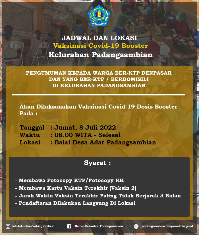 Akan dilaksanakan vaksinasi covid-19 booster pada Jumat, 8 Juli 2022 di Balai Desa Adat Padangsambian Kelurahan Padangsambian.